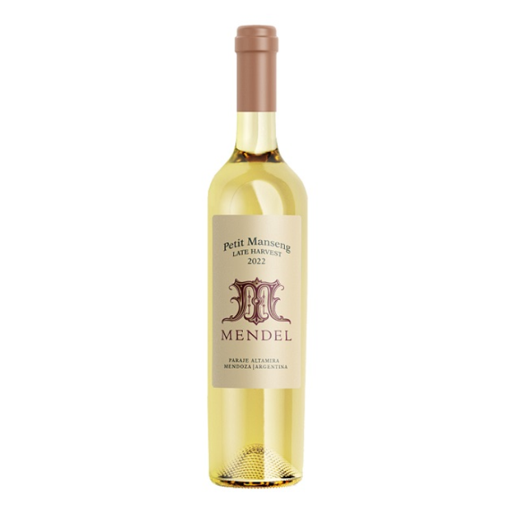 El Mendel Petit Manseng Late Harvest es un vino blanco dulce natural que destaca por su intensidad, dulzura y frescura. Está elaborado 100% con la cepa Petit Manseng, una variedad inusual para Argentina, proveniente de la Finca Remota en Paraje Altamira, Valle de Uco, a 1.100 msnm. La cosecha tardía permite una sobremaduración de la uva en la planta, concentrando los azúcares, sabores y la acidez natural, lo que es crucial para equilibrar la dulzura. Bajo la dirección del enólogo Roberto de la Mota, el mosto se obtiene mediante un prensado suave de los racimos enteros. La fermentación se realiza en pequeñas vasijas de acero inoxidable y una parte en barricas de roble francés. De color amarillo dorado con reflejos verdosos, el vino tiene una gran intensidad aromática con un perfil de frutas tropicales almibaradas, donde sobresalen notas a mango, duraznos, damascos y ananá. Estos aromas frutales se complementan con sutiles matices florales de jazmín y toques de frutos secos como almendras y avellanas. En boca, su entrada es amable y dulce, pero su característica distintiva es el gran equilibrio entre su untuosidad y su acidez refrescante, lo que lo hace vibrante y nada empalagoso. La complejidad aromática del paladar se mantiene, terminando en un final persistente, franco y sedoso.
