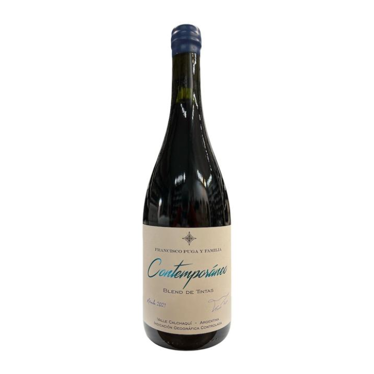 El vino Contemporáneo Blend de Francisco Puga y Familia es la propuesta más moderna del proyecto, buscando reflejar la evolución y el refinamiento de la viticultura en el Valle Calchaquí. Su composición varietal principal en la cosecha 2022 es 60% Cabernet Franc, una cepa que ha ganado gran prestigio en Argentina por su elegancia y frescura, complementado con 30% Malbec (que aporta fruta y cuerpo) y 10% Merlot (que suma suavidad). Las uvas provienen de diferentes terruños de altura, como Loro Huasi, Yacochuya y Altupalka en la zona de Cafayate y Molinos, Salta, con viñedos ubicados entre los 1.700 y 2.260 metros sobre el nivel del mar. En la bodega, cada varietal se vinifica por separado en pequeños recipientes, incluyendo tanques de acero inoxidable, barricas y vasijas de concreto. El Cabernet Franc, el Malbec y el Merlot tienen un período de crianza de aproximadamente 12 meses en estos recipientes, utilizando principalmente barricas de roble usadas. Este método busca un assamblage preciso para lograr un vino que es a la vez potente y sutil, con una acidez bien marcada que garantiza un potencial de guarda de hasta 10 años. Las notas de cata revelan un vino de color rojo intenso y profundo con reflejos violáceos. En nariz, es elegante y complejo, destacando la expresión herbal y especiada del Cabernet Franc, junto a notas de fruta negra (cassis, mora) y un matiz dulce. En boca, es jugoso, fresco y equilibrado, dominado por una sensación que Patricio Tapia (Guía Descorchados) describe como la expresión herbal del Franc y una sensación de fruta fresca y jugosa. Posee taninos firmes y afilados, pero con un paso amplio y complejo que deja un final persistente, haciéndolo ideal para la gastronomía.